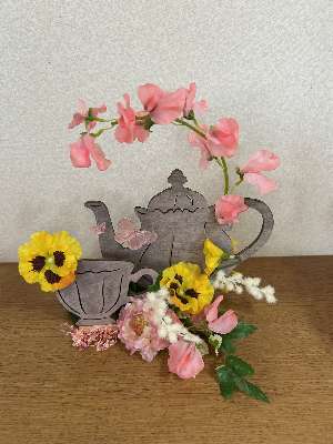 木製のティーポット&カップのセットに春のお花を飾ります。スイトピー、パンジー、ミモザなど春のお花をグ…